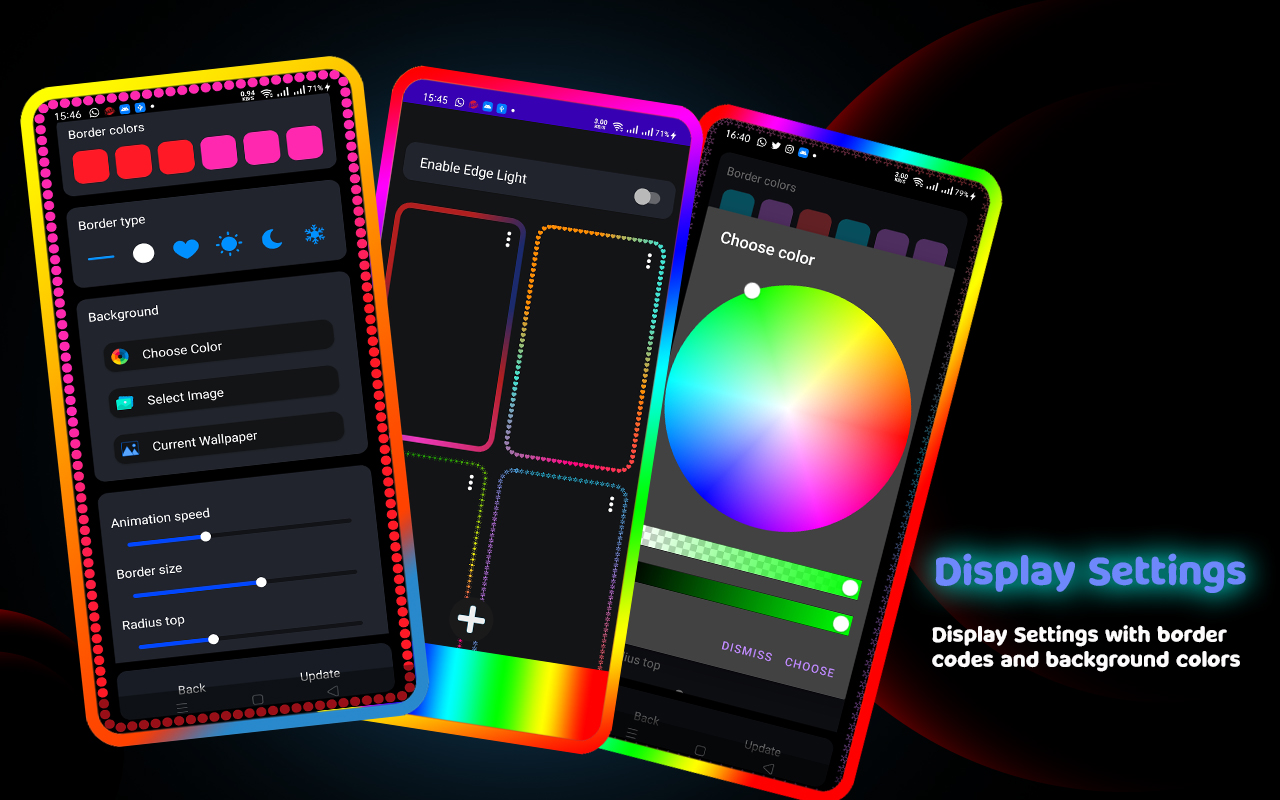 L'application Borderlight ajoute des coins RVB légers et ronds à votre écran. Cette application convient à tous les appareils Android. Le fond d'écran animé Border Light propose une large collection de clips d'éclairage de bord. edge Changez l'écran de votre appareil en une belle lumière de bord - bordure, bordures de papier peint.