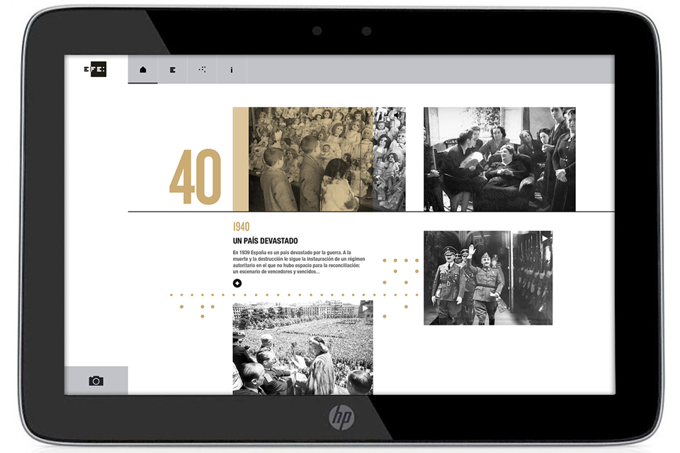 Pour profiter de l'application interactive EFE 75, vous pouvez utiliser la tablette dans la chambre ou télécharger l'application sur votre téléphone mobile ou tablette. Navigation dans la chronologie et à travers la caméra de l'appareil bénéficient contenu supplémentaire comme des galeries, des vidéos, des cahiers interactifs et la machine Baudot. Profitez d'une nouvelle façon de voir et de vivre.