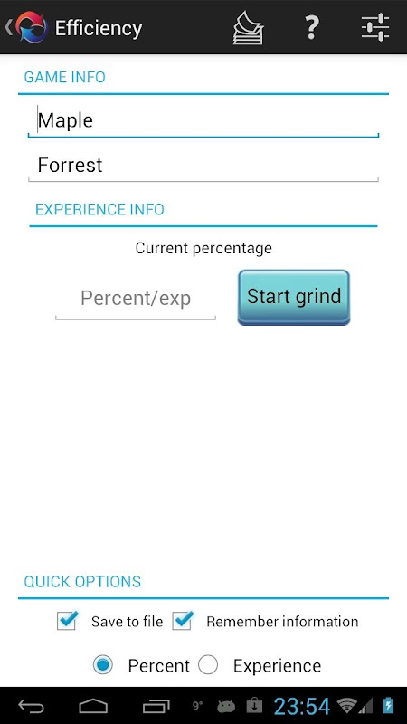 Entrez le montant de votre expérience pour cent ou exp actuelle. Broyer pendant quelques minutes et entrez votre puis pour cent / montant. Vous obtiendrez votre expérience par rapport au nombre de minutes! Enregistrez-le si vous voulez voir vos dernières courses, comparez les meilleurs spots de broyage.