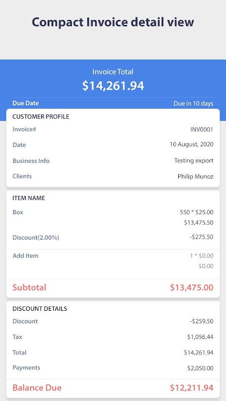 L'application génère facilement une facture et un devis professionnels. Il calcule automatiquement les taxes, les remises, le montant total et le montant à payer. Vous pouvez également signer vos factures et devis. Vous pouvez également enregistrer des notes supplémentaires, des images et des détails de paiement dans votre facture/devis. L'application vous permet d'enregistrer, de partager et d'imprimer vos factures et devis.