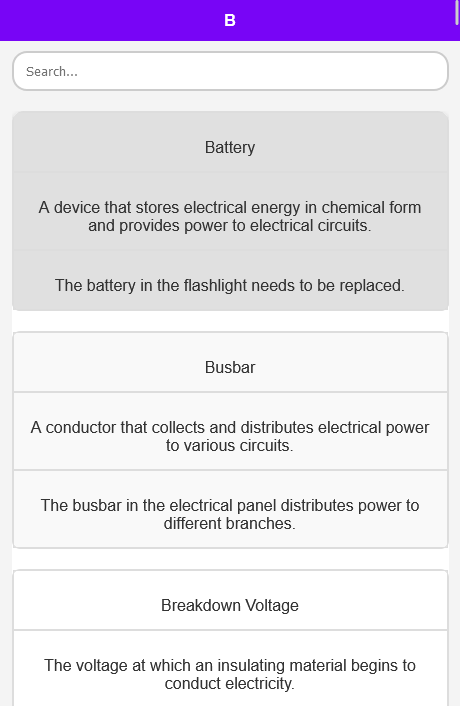 Bienvenue dans l'application de dictionnaire électrique conçue pour être votre ressource complète pour comprendre la terminologie électrique. Que vous soyez étudiant, ingénieur ou passionné. Le dictionnaire électrique est conçu pour répondre à vos besoins avec clarté et facilité. Si vous recherchez une application de dictionnaire électrique, vous êtes au bon endroit. Cette application vous fournira les termes électriques les plus importants et les plus couramment utilisés avec une signification et des exemples.