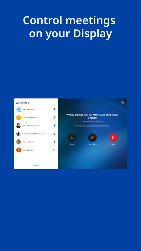 • Contrôlez les réunions en cours sur votre écran Elevate Rooms - partagez la vidéo, activez/désactivez le son, quittez ou mettez fin aux réunions, et bien plus encore