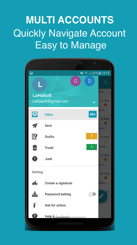 ✓ Support multiple e mail accounts, easy to switch between all mail account.