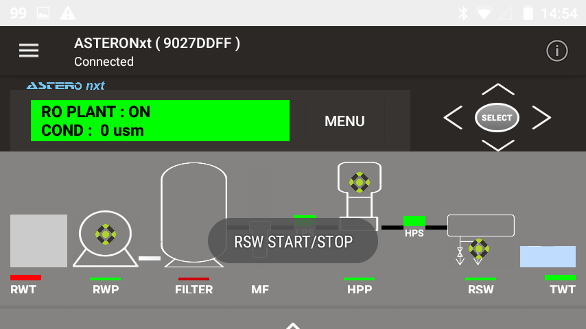 Contrôle, Start - Stop usine, basculer entre le mode automatique et manuel. Contrôle de l'eau brute, pompes à haute pression, etc.
