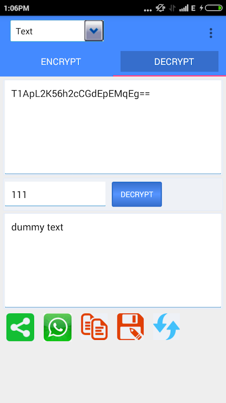 1. TEXT - Encrypt - Decrypt text messages with key and share same using messaging apps available on phone like whatsapp ,SMS etc.