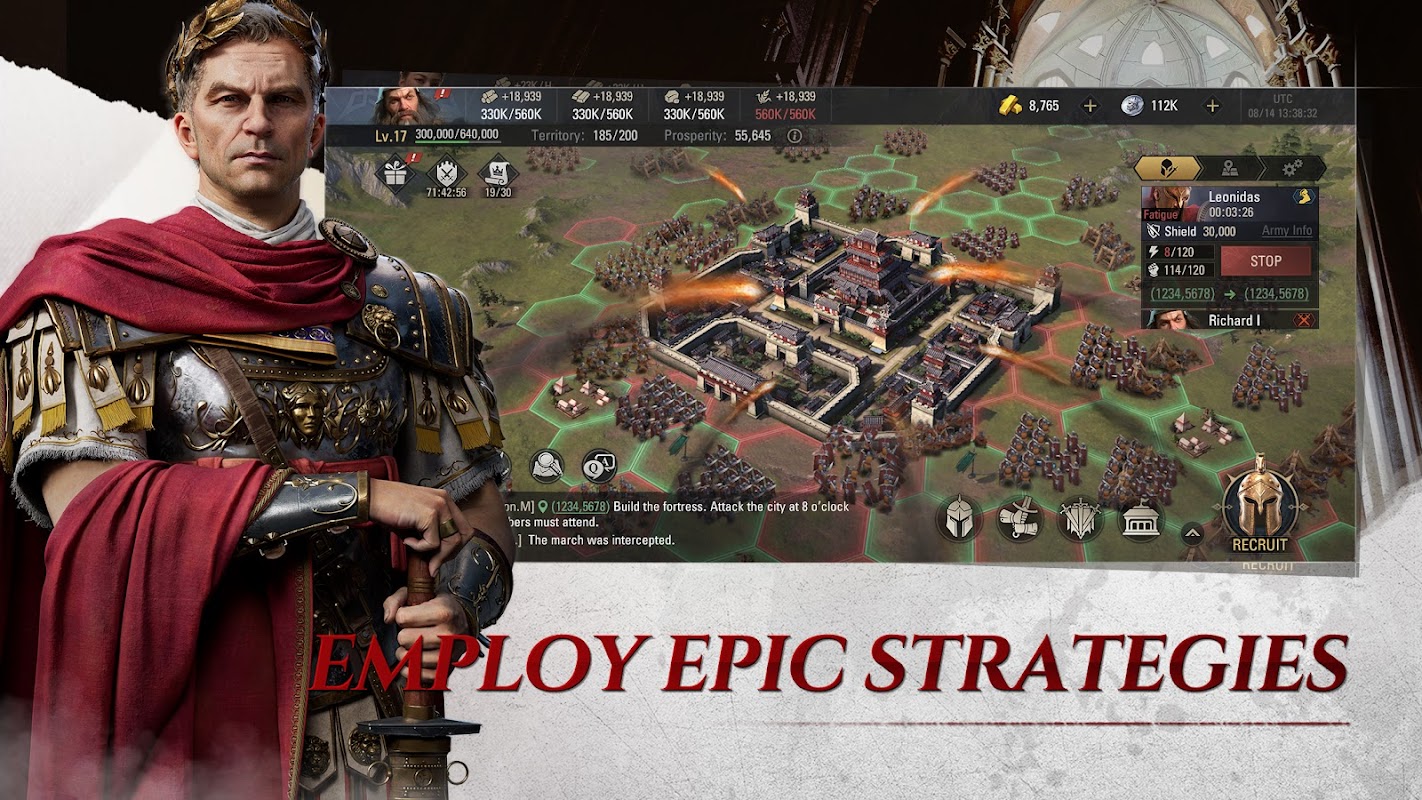 Recruit from over 100 different legendary Heroes to help you command your troops and manage your city! Get famous names in history, such as Julius Caesar, Alexander the Great, and Joan of Arc to help you establish your indomitable empire!