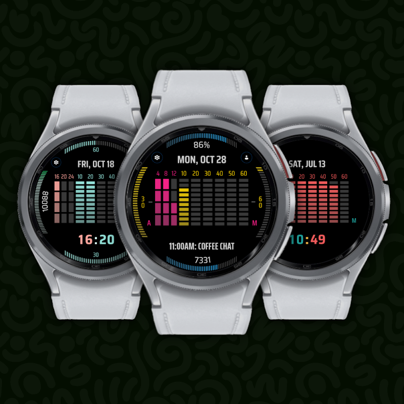 Le cadran de montre "Equalizer" apporte une approche nouvelle et moderne de la lecture de l'heure. Grâce à son design inspiré des égaliseurs, chaque seconde, minute et heure est représentée par une barre mobile, ce qui la rend non seulement fonctionnelle mais aussi visuellement attrayante. Le cadran de la montre offre un haut niveau de personnalisation, ce qui vous permet de l'adapter à vos besoins et à votre style. Que vous suiviez vos pas quotidiens ou que vous surveilliez l'autonomie de votre batterie, "Equalizer" fournit toutes les informations essentielles d'un seul coup d'œil.