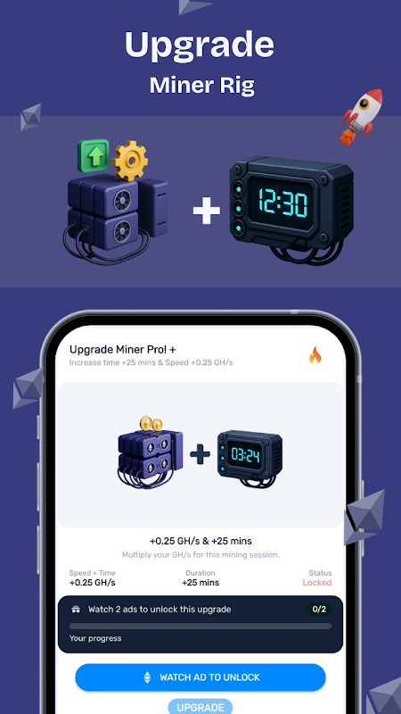 Boostez votre puissance de minage, améliorez vos rigs, débloquez de nouveaux niveaux et profitez d'une expérience de jeu fluide et sans publicité.