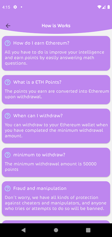 Please Note In this App you will earn points by answering math questions. You can then request ethereum with the points you earn.