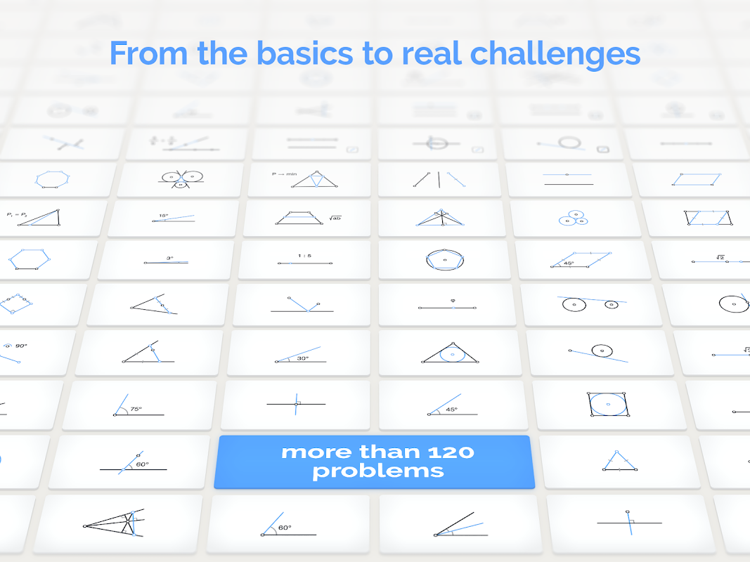 Pas d'inquiétude si vous n'êtes pas un génie des mathématiques. Euclidea commence par des défis simples qui vous guident à travers les bases. Une fois les fondamentaux maîtrisés, vous passerez à des défis plus complexes et plus complexes, comme les tangentes internes/externes, les polygones réguliers, et bien plus encore. Il y a 120 défis uniques au total, organisés en packs pour une navigation simplifiée.