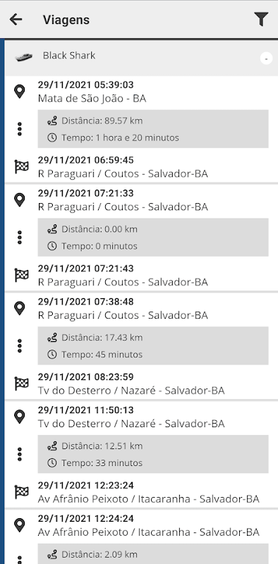 - Vue historique des positions géographiques du véhicule sur une période de temps.