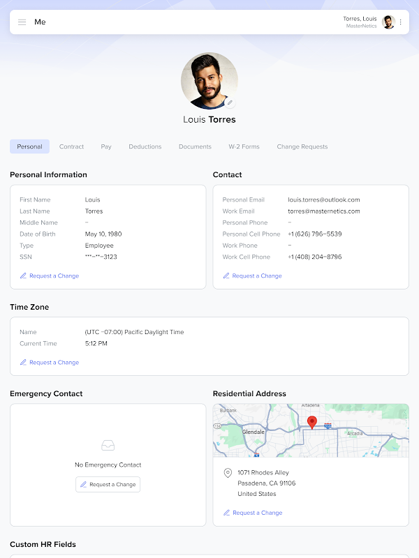 Gestion des informations personnelles : mettez facilement à jour vos informations personnelles, telles que les coordonnées, les contacts d'urgence et les coordonnées bancaires pour la paie. Gardez vos informations à jour et sécurisées.