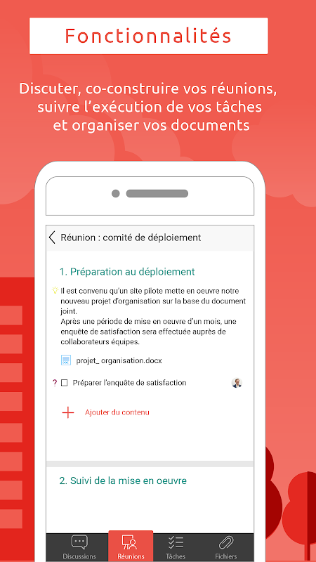 Vous pourrez ouvrir les documents directement depuis l'application. Prendre des photos depuis le fil de discussion. Lancer des invitations calendrier (Outlook, Notes, ...) pour vos réunions. Mettre en forme le texte dans le compte rendu des réunions...