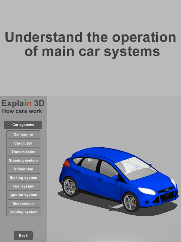 This app is suitable for kids, young people, engineers, mechanics or kids of engineers and mechanics who want to learn how cars work and main car parts like engine, differential, clutch, gearbox, ignition, pistons, exhaust, suspension, cooling or braking system. Understand how car works with Explain 3D system.