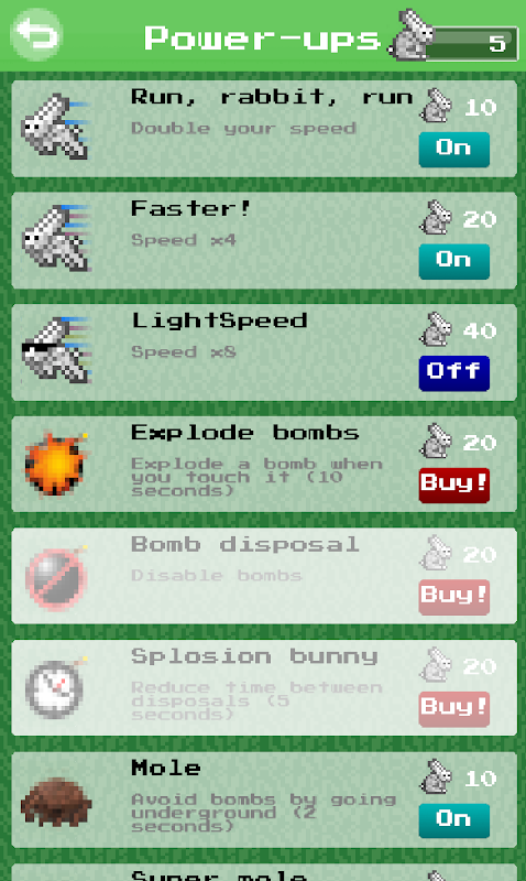 Exploding bunnies is an old-school style arcade game where you are a very cute bunny rabbit that just happens to be in the middle of a bombing. Just your luck! Your task is to dodge bombs and keep alive, for as long as you can! And while you're at it, try to save the little bunnies you will encounter, and you'll be able to get access to useful power-ups and lovely ornamental accessories.