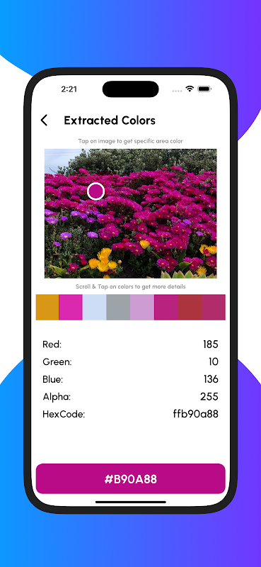Appuyez n'importe où sur l'image pour obtenir le code couleur hexadécimal et RVB exact d'une zone spécifique. Cette fonctionnalité est essentielle pour toute personne travaillant avec des graphiques, du design ou du contenu numérique, car elle facilite la recherche des codes de couleur et la correspondance précise des teintes.