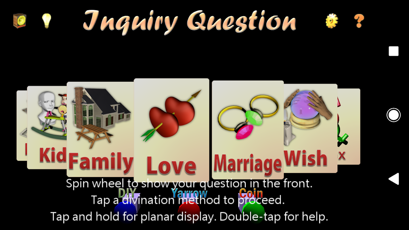 L'utilisateur peut utiliser cet outil de divination mobile pour se renseigner sur les actions appropriées à suivre ou sur les réponses aux esprits distraits et aux problèmes perplexes.
