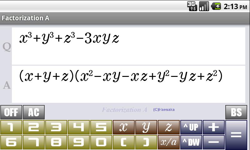 多変数多項式の因数分解<Factorization>/展開<Expansion>用の電卓アプリです。x, y, z(または a,b,c)3変数で各変数とも5乗までの数式が考慮されます。