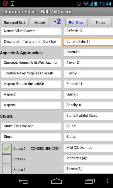 Les zones de texte doivent être petits pour essayer d'adapter une feuille de personnage entier dans une taille d'écran de téléphone pour une page de notes est prévu pour chaque feuille de personnage pour l'enregistrement des détails supplémentaires sur la description, Haute Concept, Cascadeur etc a des boutons pour ajouter modèle de cascade texte.