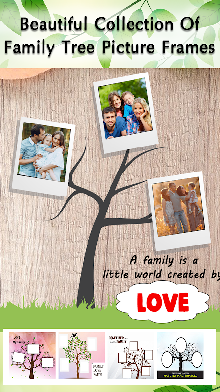 Les cadres photo Family Tree permettent de créer l'arbre généalogique le plus récent et créatif de vos photos! Créer une ascendance fabuleuse en combinant des photos ordinaires avec l'application de cadres d'arbre généalogique. Syndiquer vos souvenirs de famille à un endroit avec notre fabricant d'arbres de la famille unique et adorer via des effets de retouche photo.