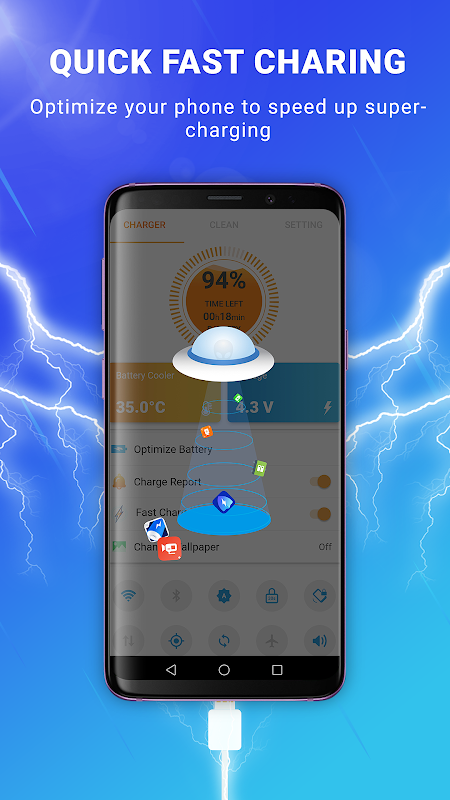 En utilisant notre charge rapide de la batterie, vous n'aurez pas à attendre des heures pour recharger complètement la batterie, votre batterie protégera et sera prise en charge plus rapidement. Notre application chargeur de batterie rapide intègre trois fonctionnalités GRATUITES extrêmement professionnelles: optimisation des périphériques, batterie charge rapide et protection de la batterie. En plus de permettre une chargeur rapide de batterie, Super Fast Charger dispose également d’outils pour optimiser et alimenter votre appareil, comme libérer de la mémoire pour accélérer votre téléphone, batterie refroidisseur et refroidisseur de téléphone et le booster la charge de batterie. Verrouillage de l’écran de fond pour modifier le verrouillage du papier peint à l’écran chaque jour. De plus, grâce à l’interface conviviale des applications de recharge rapide, vous serez assuré de profiter de ce chargeur de batterie rapide.