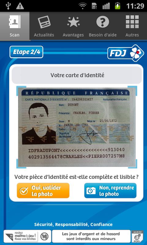 Vous venez de créer un compte FDJ® et vous souhaitez confirmer votre inscription. Pour cela, choisissez la pièce d’identité de votre choix : Carte d’identité, Passeport ou Permis de conduire et préparez votre RIB/IBAN. L’application FDJ Scan vous permet de les prendre en photo instantanément et de les envoyer à FDJ simplement, rapidement et en toute sécurité.
