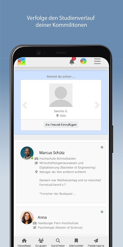L'application convient à tous les étudiants à distance (comme la FernUni Hagen, la SRH-Fernhochschule, l'IU Internationale Hochschule ou la PFH Göttingen) et à tous les étudiants à distance, par exemple à l'Institute for Learning Systems (ILS), à la Communauté d'études de Darmstadt (SGD) ou étudiez à l'institut d'études IST.
