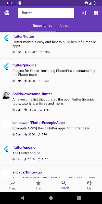 Using the GitHub client developed by flutter, Fg includes features such as Trend,Start,Search and My.
