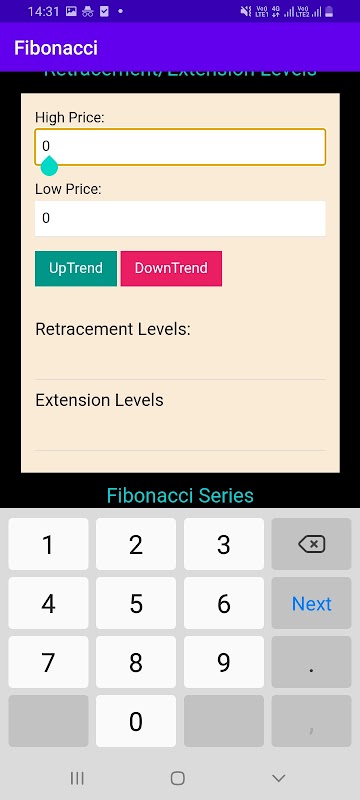 Pour utiliser cette application Fibonacci, il vous suffit d'insérer le prix élevé et le prix bas dans la zone de texte et d'appuyer sur le bouton. Il existe deux options pour les réponses de retracement. La première est une tendance à la hausse et la deuxième est une tendance à la baisse.