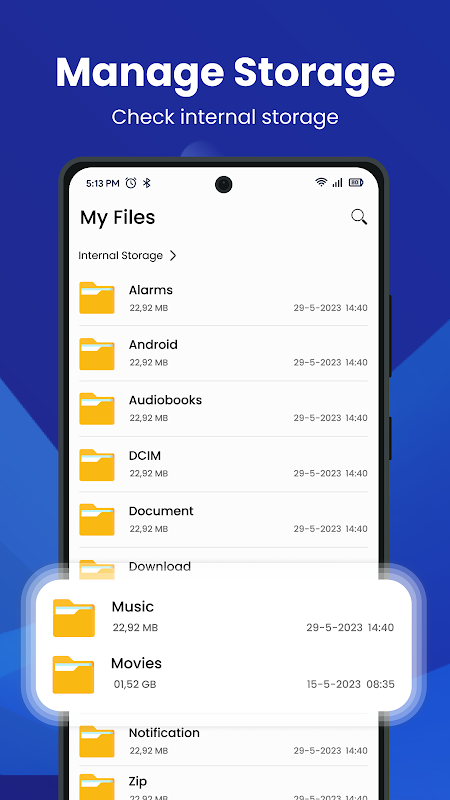🗃 Gérez facilement le stockage et aide à redéfinir la façon dont vous interagissez avec l'espace interne de votre appareil. Vérifiez sans effort le stockage interne. Qu'il s'agisse de libérer de l'espace, d'optimiser les performances ou d'organiser des fichiers, cette application de gestion du stockage fournit une solution simple. Prenez le contrôle du stockage de votre appareil avec l'application Explorateur de fichiers, libérez votre mémoire lorsqu'elle est pleine et supprimez les fichiers inutiles.