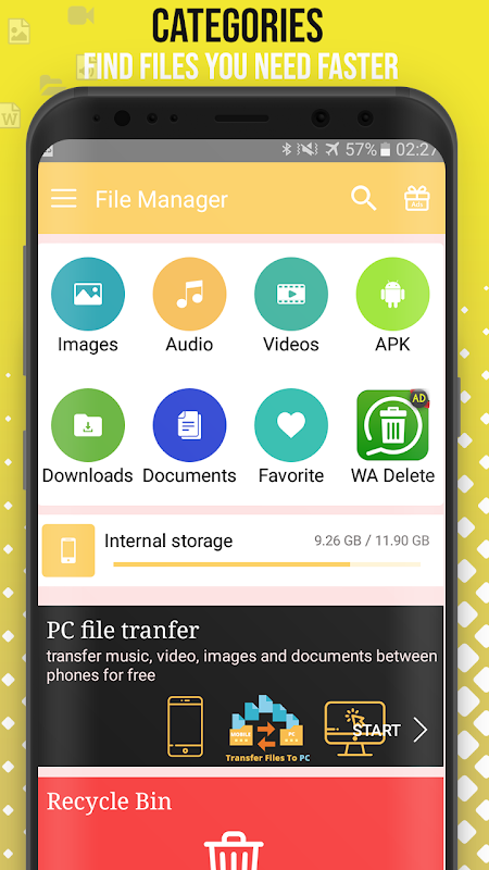 Les fichiers de recherche optimisés pour les moteurs de recherche trouveront les fichiers dans la mémoire interne et les cartes SD en 1 seconde. Et les utilisateurs peuvent parcourir les fichiers par genre, tels que des photos, de la musique, des vidéos, des applications ...