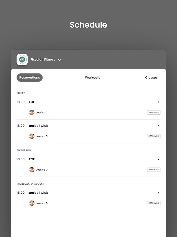 Réservations de cours et gestion de compte pour les membres de Fixed on Fitness