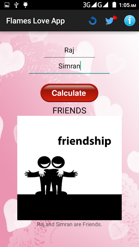 Ci-dessous est un jeu d'amour, un simple test d'amour utilisant uniquement des noms. Flames signifie Friends, Love, Affair, Marriage, Inimity and Sister.