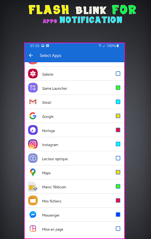 ✔ Application de notification Flash: Flash clignote lorsqu'une notification provient de Toutes les applications (lorsqu'il y a des messages, des appels).