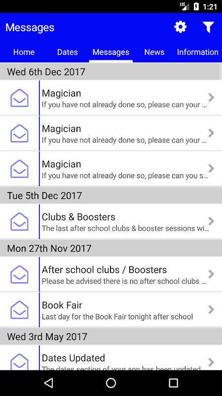 Shows all the latest stories from your school or organisation. If you tap on any news item you will be able to see more detail.