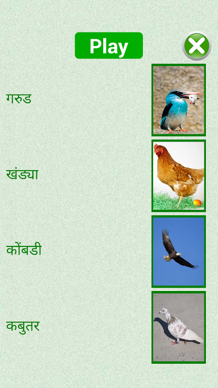 This app helps new language learner (kids to adults) to learn Marathi words in easiest way, builds vocabulary and pronunciation of basic words in categories like Alphabet, Numbers, Body Parts, Birds, Animals, Vegetables, Fruits, Colors, Shapes, and Calendar. Key feature includes,