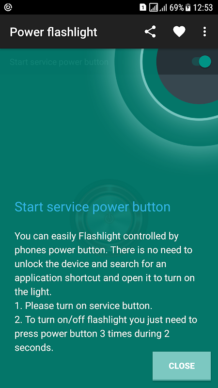 The application offers the easiest way to control flashlight by power(lock) button without unlocking the mobile device(phone).