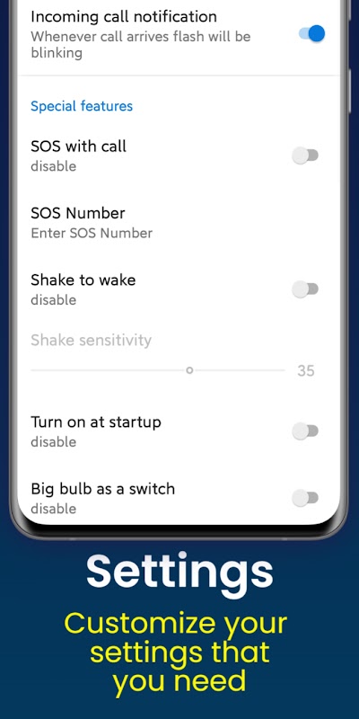 🔦 C'est une application de lampe de poche unique et facile à utiliser. Vous pouvez définir vos préférences dans les paramètres selon vos besoins. La configuration de l'application de lampe de poche imite une véritable lampe de poche matérielle, avec un interrupteur marche/arrêt que vous pouvez basculer pour allumer et éteindre votre lampe torche numérique.
