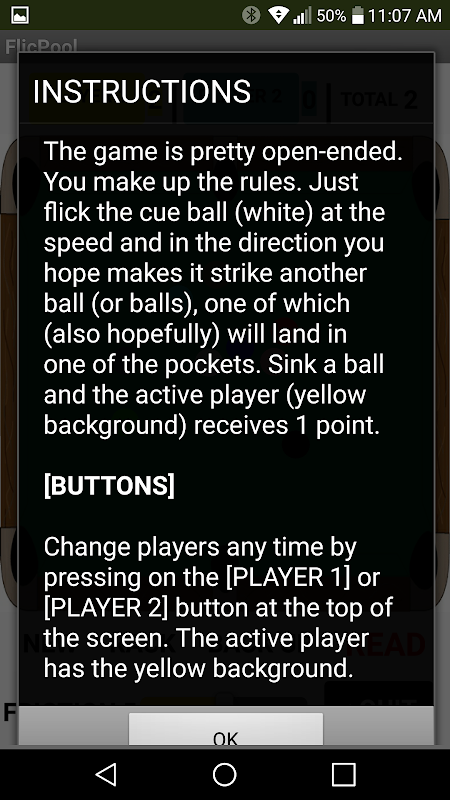 Flicpool is pretty open-ended. You make up the rules. Just flick the cue ball (white) at the speed and in the direction you hope makes it strike another ball (or balls), one of which (also hopefully) will land in one of the pockets.