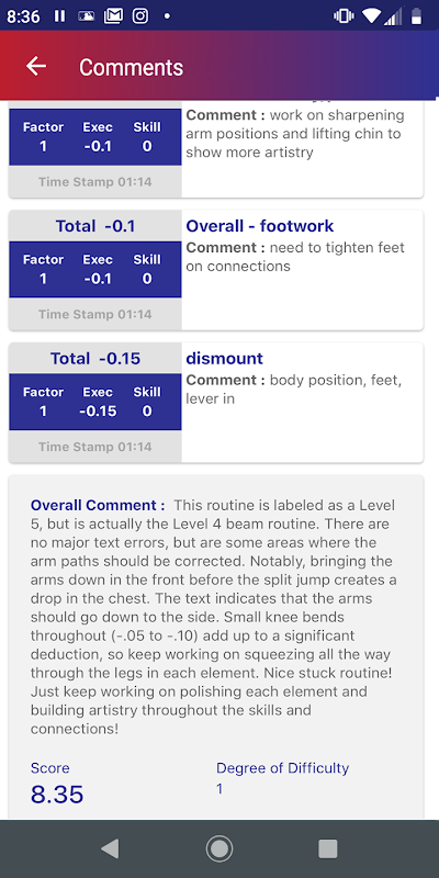 Téléchargez un enregistrement d’une performance ou d’une routine. Nous vous ferons parvenir une partition et les détails à l’appui d’un juge certifié dans votre sport. Construire une bibliothèque de réalisations et de faits saillants. Partagez toutes vos nouvelles partitions avec vos entraîneurs, amis, famille et coéquipiers.