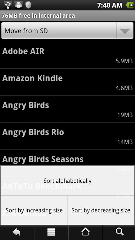 Vous pouvez également déplacer des applications en arrière, et trier par ordre alphabétique ou par taille de apk.