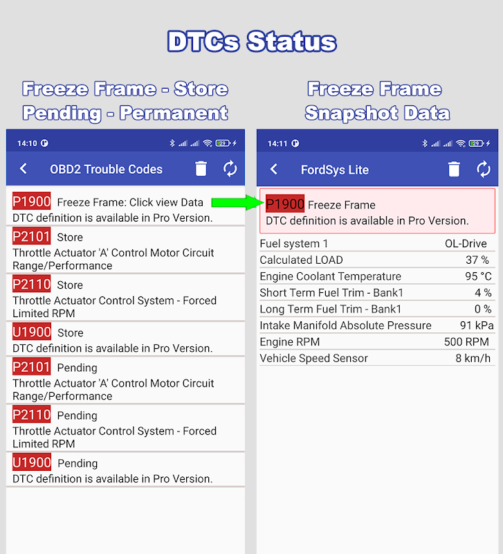 - Base de données DTC intégrée avec plus de 10 000 codes d'anomalie de codes spécifiques au fabricant Ford