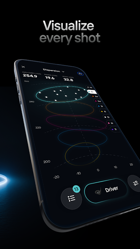 * Analyse avancée des tirs – Obtenez des informations plus approfondies sur chaque tir grâce à des visualisations détaillées, notamment des cercles de dispersion, des marqueurs de distance, des tableaux riches en données et des vignettes intuitives qui vous aident à comprendre votre swing comme jamais auparavant.