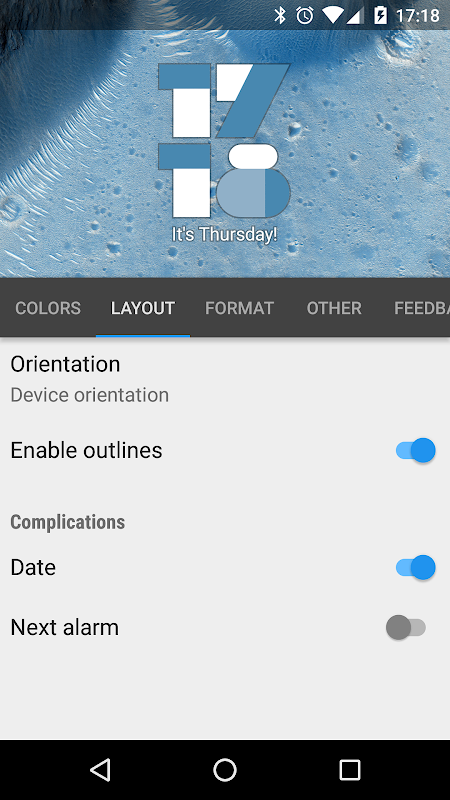 Dans le compagnon application Réglages, vous pouvez choisir vos couleurs de widgets ou de laisser la couleur widget lui-même basé sur votre fond d'écran actuel. Sur Android Kitkat et au-dessus, vous pouvez choisir d'avoir le widget animé lorsque les changements de temps. S'il vous plaît noter que l'activation de l'animation peut causer des problèmes de performance, y compris augmentation de la consommation de la batterie!