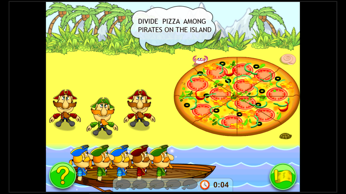 C'est une façon amusante et facile à apprendre fractions tout en jouant avec les pirates d'allumage lumineux . Servir des pizzas et des gâteaux ronde équipage de pirates affamés , aller avec eux sur les balançoires , et de les amener à travers l'abîme . Apprendre à lire , comparer et additionner des fractions . Il ya quatre jeux en un . Chaque jeu est représenté par une île . Sur la première île , nous apprenons à lire fractions . Offrez à vos pirates sur l'île quelques tranches de pizza et deviner quelle partie de la pizza est laissé pour d'autres pirates à manger dans le bateau . Si vous faites une erreur , ils vont être en difficulté .