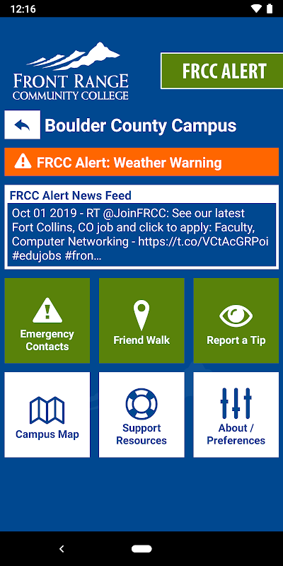 FRCC Alert est l'application de sécurité officielle de Front Range Community College. C'est la seule application qui s'intègre aux systèmes de sécurité de FRCC. Campus Safety and Security a travaillé au développement d'une application unique qui offre aux étudiants, aux professeurs et au personnel une sécurité accrue sur le campus de la FRCC. L'application vous enverra des alertes de sécurité importantes et vous donnera un accès instantané aux ressources de sécurité du campus.