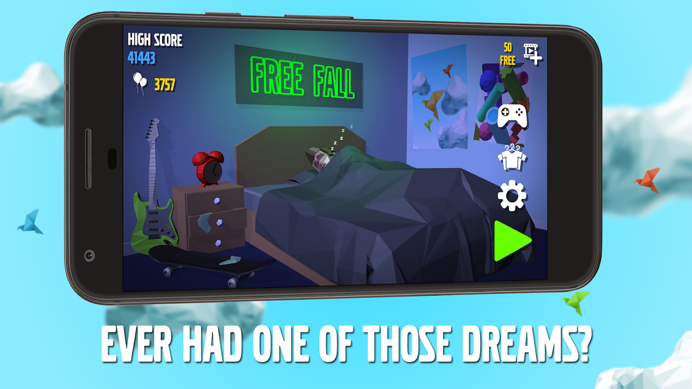 Free Fall est un jeu de parachutisme / Base Jump au rythme rapide avec une différence ! Plongez dans le ciel la tête la première dans un environnement de tunnel en constante évolution, sinueux et tournant, rempli de formes colorées et d'obstacles pour que vous puissiez voler ou tomber à travers, sinon... eh bien... vous êtes coincé, avec un gros splat !