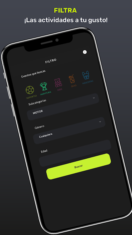 Une fois que vous vous êtes inscrit, lorsque vous accédez à l'App, vous verrez les événements des catégories que vous avez sélectionnées, et du sexe et de l'âge que vous souhaitez. Ceux qui vous apparaîtront seront toujours les plus proches de votre domicile, et vous pourrez choisir la distance à laquelle vous souhaitez qu'ils apparaissent.