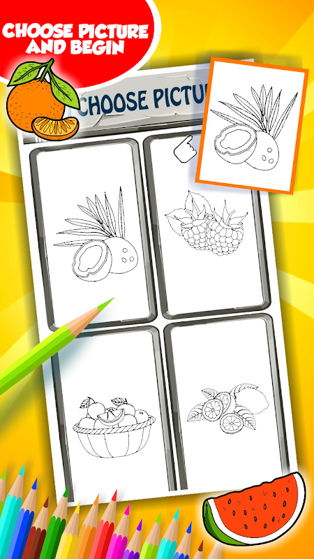 Grab the sketch of the watermelon and imagine that you can have only one piece of it right now. It is so delicious and refreshing during the hot summer days and you love it so much. Unleash your creativity to make the top photo out of it. Share it then with your children to surprise them with your artworks. You will find this one and many more popular fruit coloring images on the choose picture page. There you can select any one of them and they will entertain you wonderfully. If you wish you can also create your own image just, tap on the pencil and adjust its size to suit your needs. Give your phone to the toddlers and they will have fun while they doodle. This sensational educational game will in that way improve their hand-eye coordination. Do not hesitate but tap on the eraser if you ever make a mistake while you paint. Let the sketch of your favorite bananas remind you of your favorite dessert made of them and chocolate cream. You will spend hours working on this illustration and slowly you will forget all your problems and worries thanks to the newest Fruit Coloring Book.