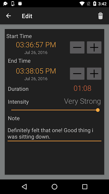 Votre histoire du travail complet et le progrès de la contraction seront enregistrées indépendamment du fait que vous redémarrez l'application au cours de votre travail, ou redémarrez l'ensemble du dispositif. Il n'y a pas besoin de garder cette application ouvrir tout le temps. Vous pouvez même envoyer votre histoire de contraction à un professionnel de la santé ou à vous-même pour vos propres dossiers.